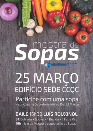 É já no dia 25 de Março que se vai realizar a 3ª edição da Mostra de Sopas CCQC! Se quiser participar com uma sopa só tem que se inscrever na Secretaria do CCQC até dia 23 de Março. Se quiser vir apenas conviver e provar as sopas deliciosas que vamos ter, basta apenas aparecer! O baile com Luís Rouxinol terá início pelas 15h30, sendo seguido da Mostra de Sopas. O valor de entrada inclui o baile, a prova de todas as sopas, uma bebida e uma fatia de pão, também haverá mais petiscos!