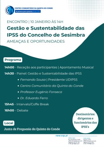 Para começar o ano da melhor forma, o Centro Comunitário da Quinta do Conde promove, no próximo dia 10 de janeiro, às 14h, um encontro dedicado ao tema “Gestão e Sustentabilidade das IPSS do Concelho de Sesimbra – Ameaças e Oportunidades”, que terá lugar na Junta de Freguesia da Quinta do Conde.