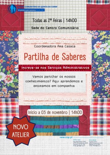 A partir da próxima semana retomamos o nosso atelier de “Partilha de Saberes”, que terá espaço todas as segundas a partir das 14h00.
