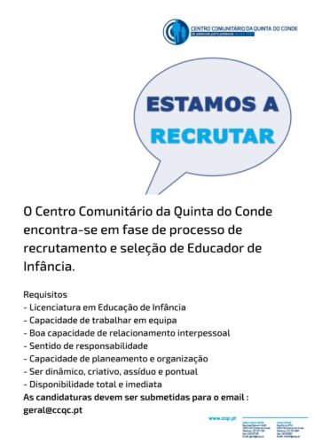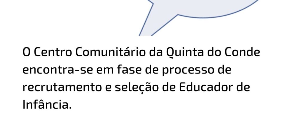O Centro Comunitário da Quinta do Conde encontra-se em fase de processo de recrutamento e seleção de Educador de Infância.