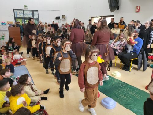 Hoje as crianças do jardim de infância desfilaram como traquinas macacos, sábias corujas e ternurentos gatos, enchendo a festa de animação.