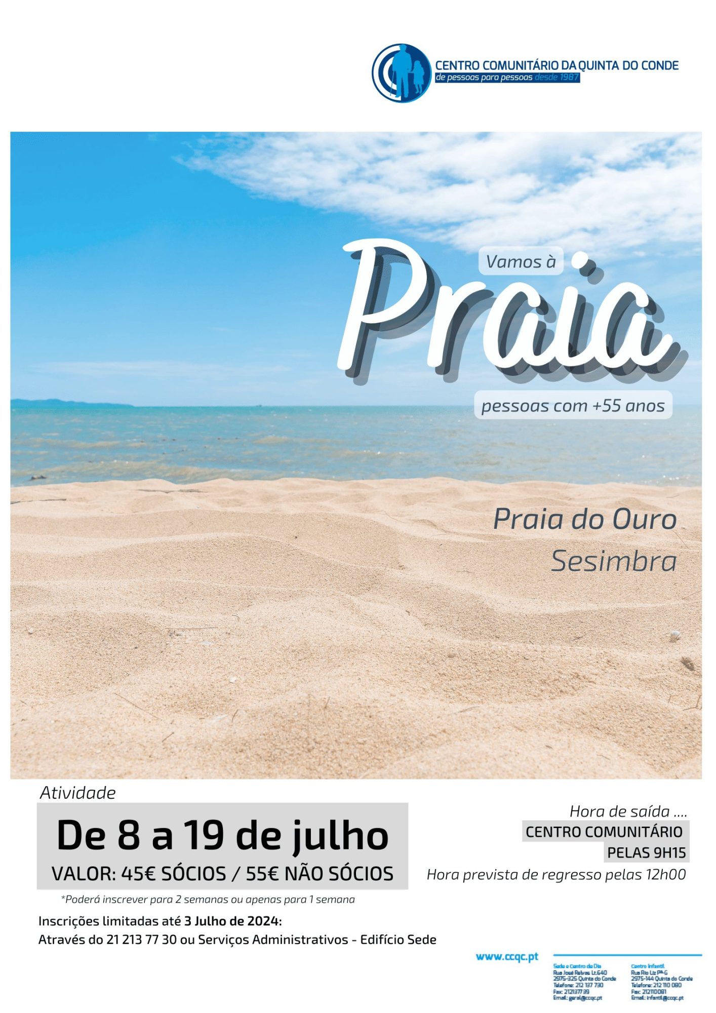 Estão abertas as inscrições para a atividade da praia para pessoas com mais de 55 anos. A atividade realiza-se entre os dias 08 e 19 de julho, na Praia do Ouro, em Sesimbra, sendo que as inscrições terminam no dia 03 de julho. Para inscrições e mais informações pode dirigir-seVeja Artigo Completo
